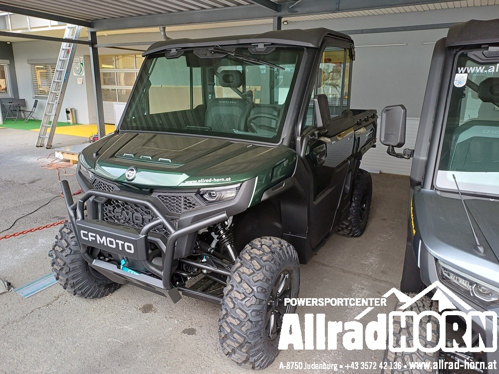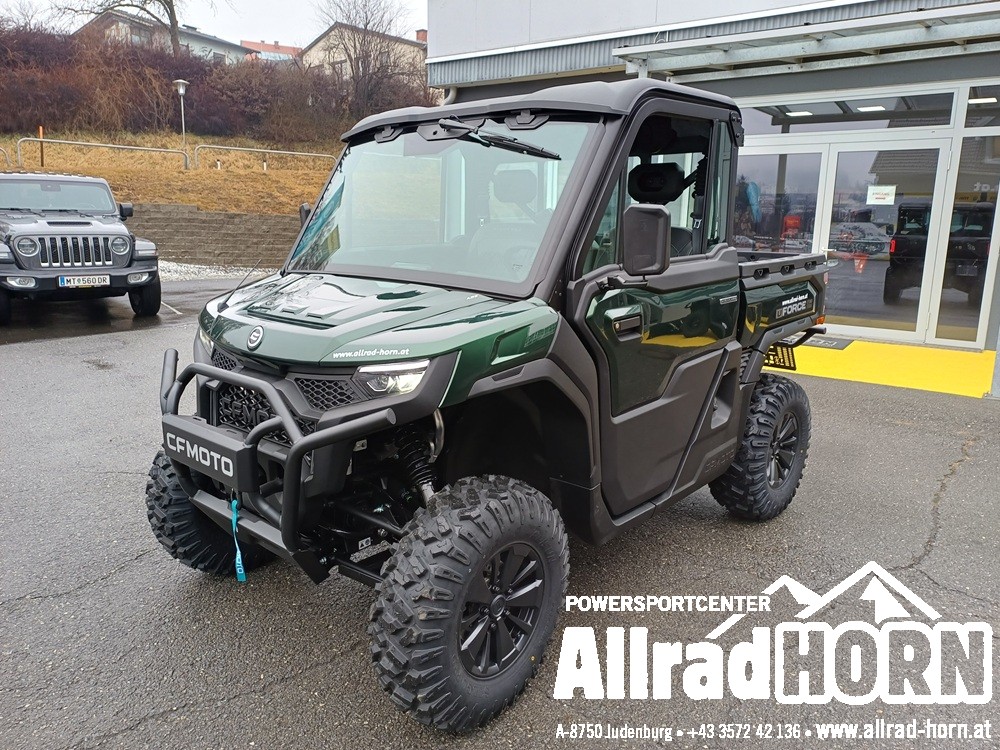 Vorführfahrzeug! CF Moto CForce 450 L ABS, mit T3b Straßenzulassung, Farbe: Hunter Green, EZ: April 2025, KM-Stand: 1.100, CF Motor mit 400 ccm und 33 PS, V-max 90 km/h, CVT-Getriebe, Allradantrieb, Untersetzung und Differenzialsperren vorne und hinten zuschaltbar, ABS, 12 Zoll Aluminiumfelgen mit 25er Bereifung, Seilwinde vorne mit synthetischen Windenseil und 1.134 kg Zugkraft, Handschutz; AHV mit Steckdose, LED Beleuchtung hinten; LCD Display ; USB; 1 oder 2 zeiliges Kennzeichen; Doppelsitzer, inkl. Gepäckbox hinten, Rammschutz vorne und hinten uvm.
