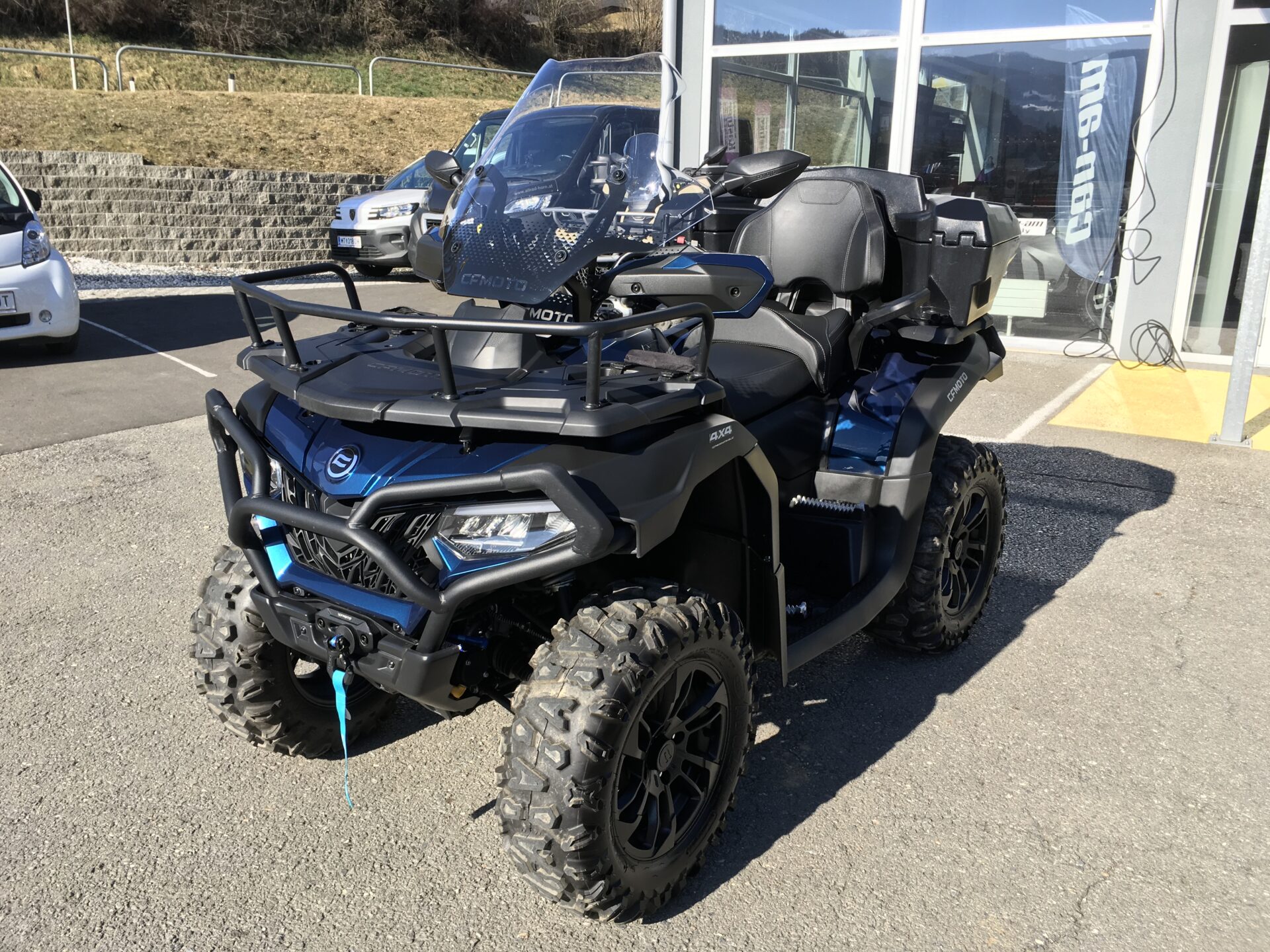 Jungfahrzeug! CF Moto CForce 625 Touring ABS, mit T3b Straßenzulassung, Farbe: Twilight Blue Metallic. EZ: März 2025, KM-Stand: 780, CF-1-Zylindermotor mit 580 ccm und 45 PS, V-MAX 95 km/h, CVT-Getriebe, Allradantrieb, Untersetzung und Differenzialsperren vorne und hinten zuschaltbar, EPS dynamische Servolenkung, ABS, 14 Zoll Alufelgen schwarz mit 26er Bereifung, lackierter Kunststoff für hochwertige Optik, Seilwinde vorne mit 1.580 kg Zugkraft inkl. Synthetikseil, Handschutz vorne, Kotflügel-verbreiterungen vorne und hinten, AHV mit Steckdose, LED Beleuchtung hinten und vorne, Doppelsitzer, Rammschutz vorne und hinten uvm.